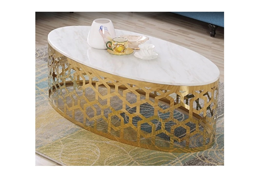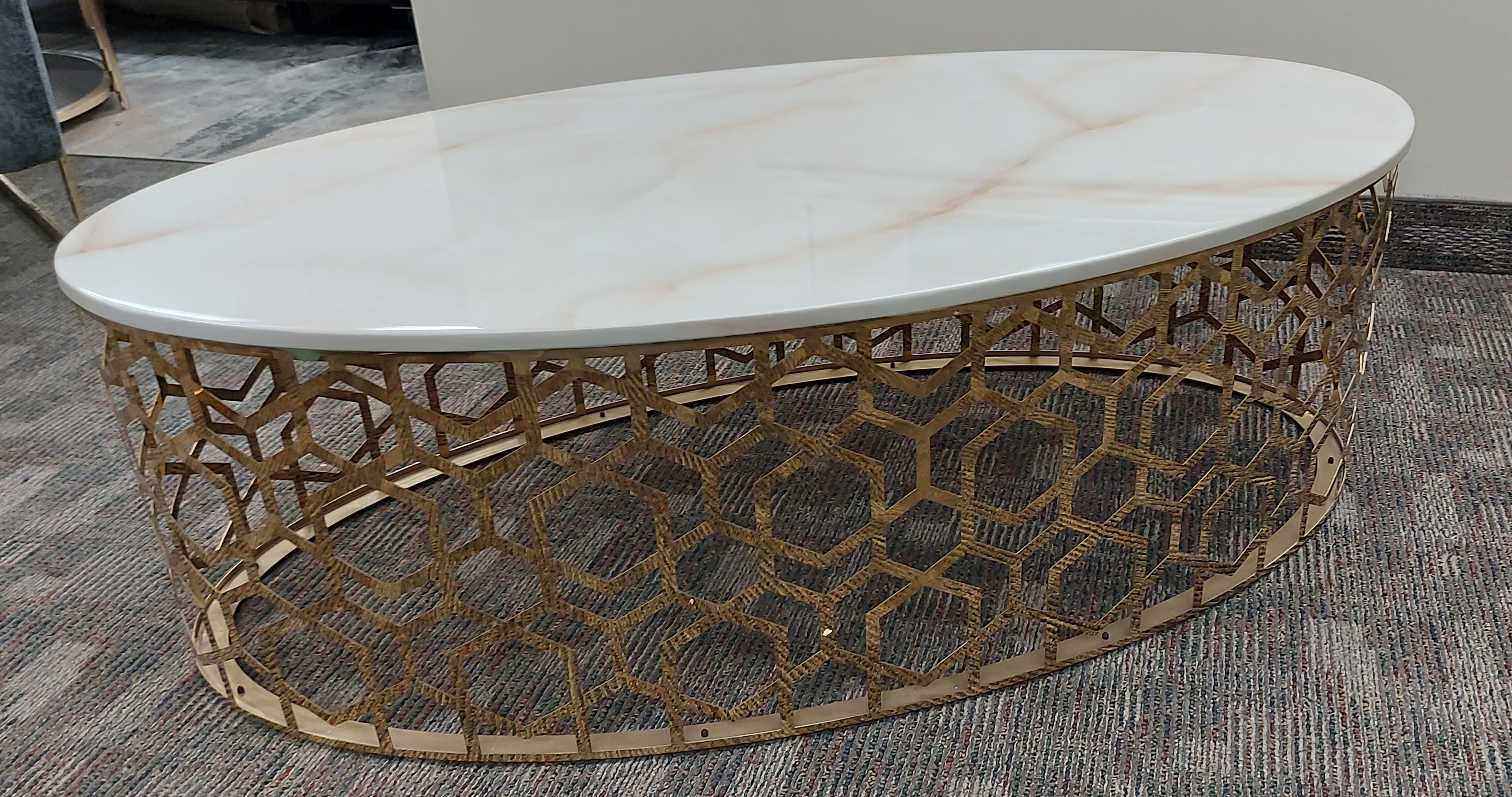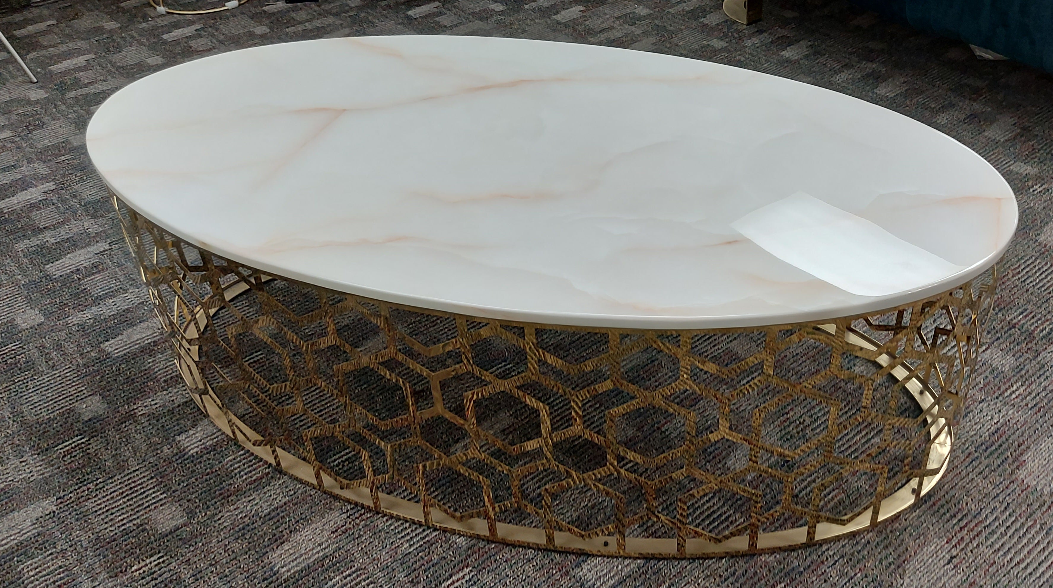 Elegant in design, this oval coffee table features a stainless steel base with intricate metal work and topped with a polished marble top.