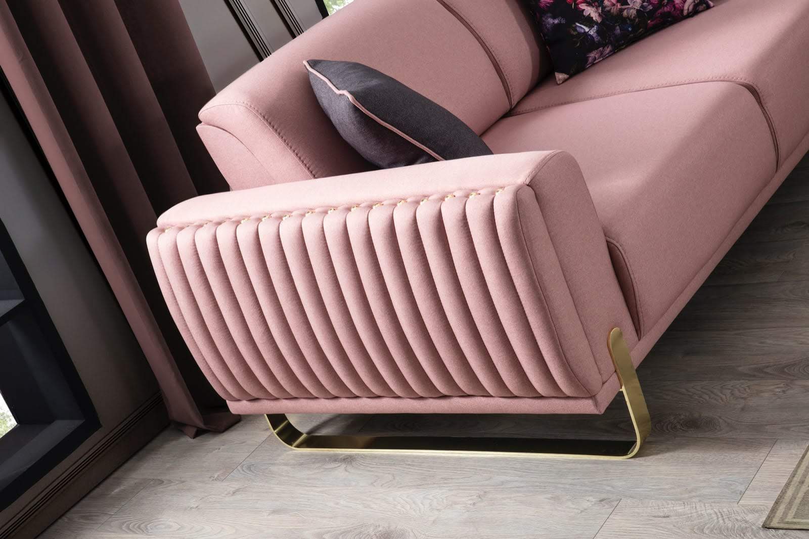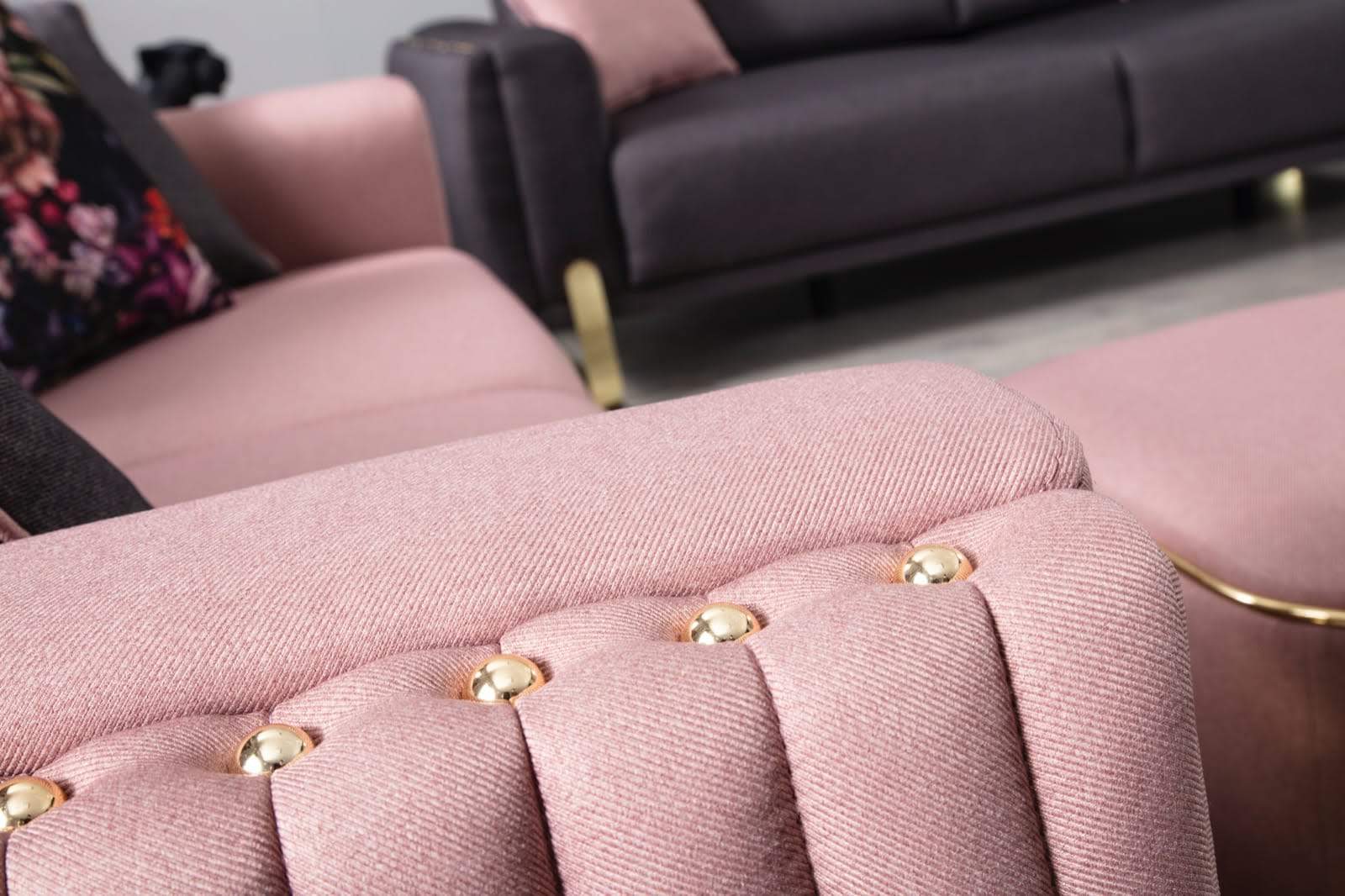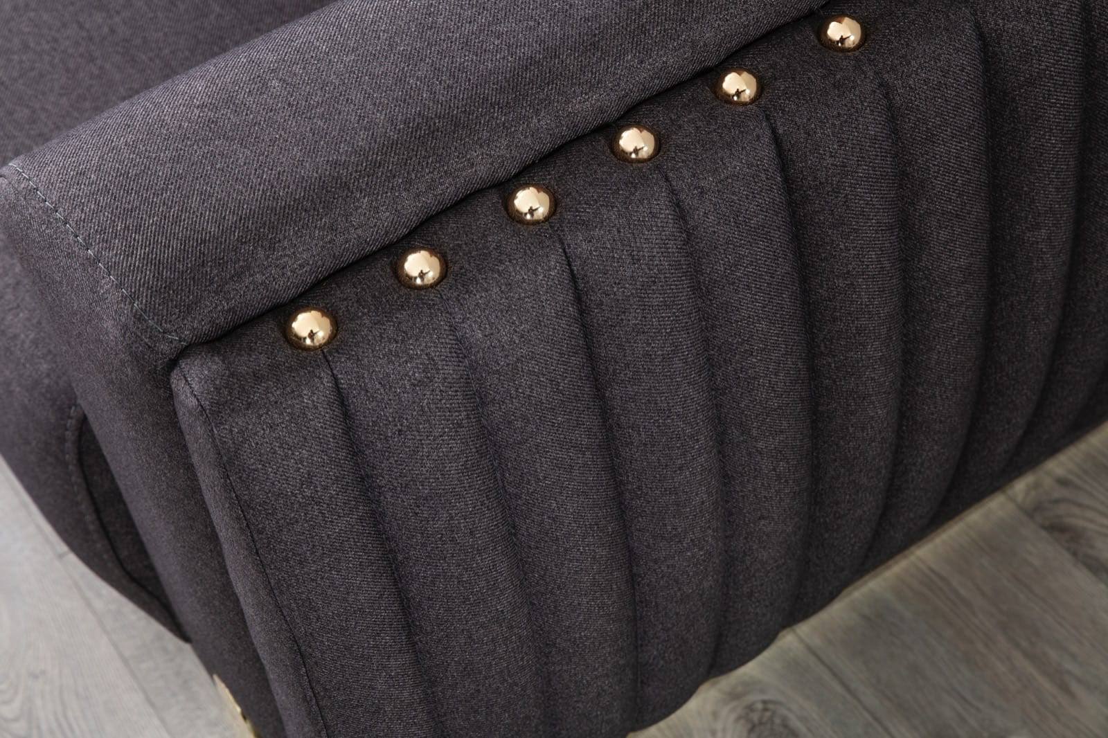 This sofa set is casual and fun, but with enough detailing to provide a sophisticated look. Channel tufting on the sides and gold button trim give this sofa chic style. Finished with a sturdy gold metal leg for a modern appearance.