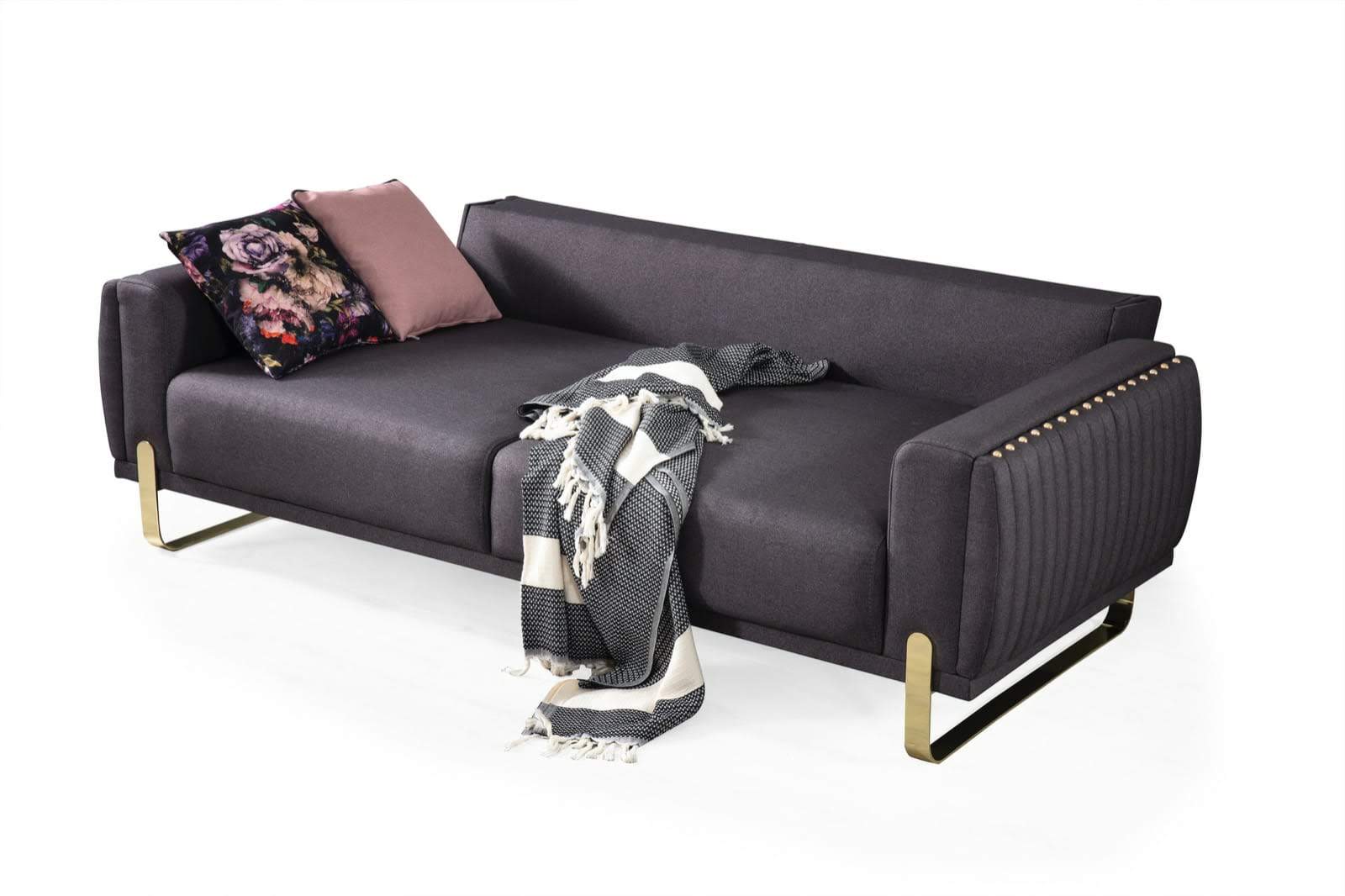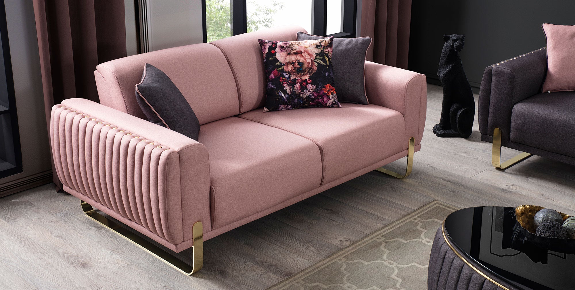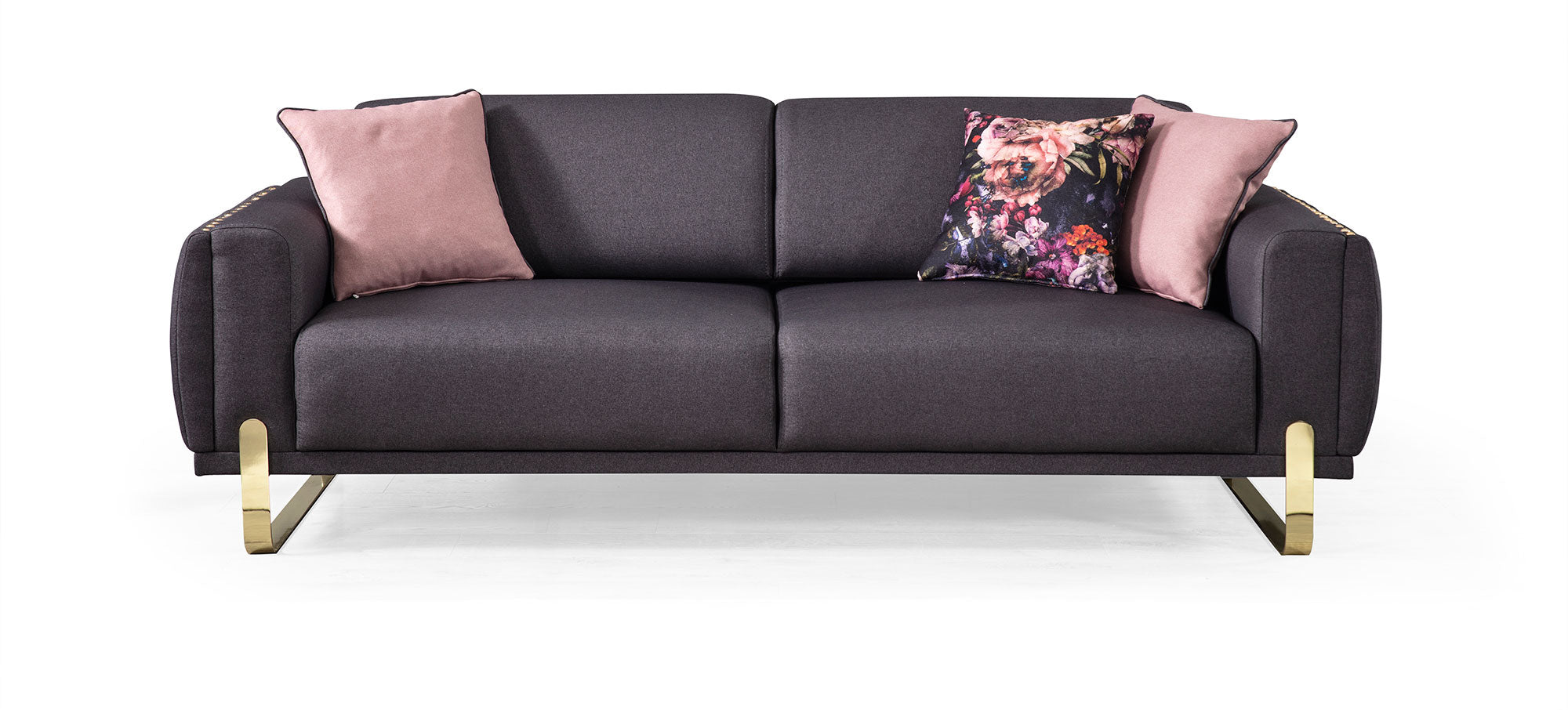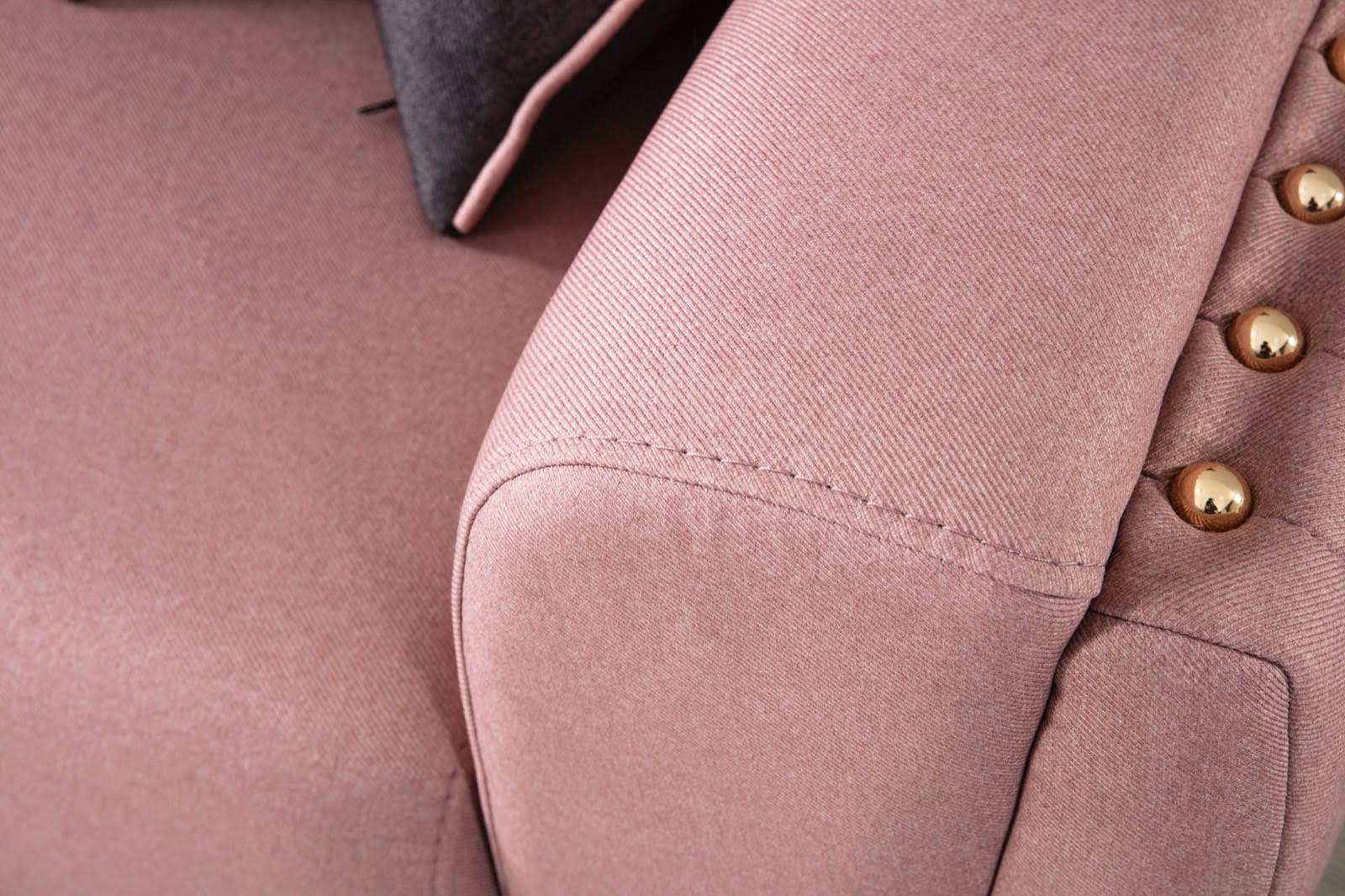 This sofa set is casual and fun, but with enough detailing to provide a sophisticated look. Channel tufting on the sides and gold button trim give this sofa chic style. Finished with a sturdy gold metal leg for a modern appearance.